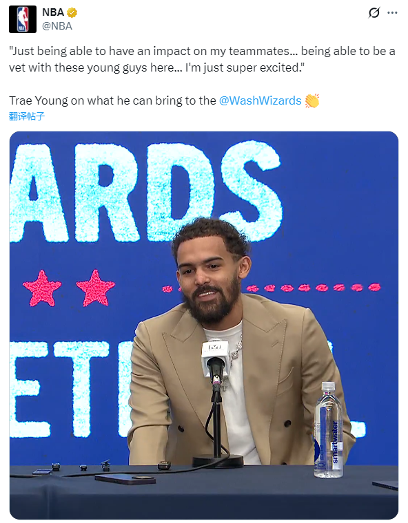 谈到自己被交易奇才,特雷-杨说道:这是超现实的,是与众不同的,也是很特别的。很兴奋能够在华盛顿打球,因为这是一个被低估的大市场。今天的一切都是新颖的,我拥抱这个地方的一切,拥抱这一刻,我很享受这里的时光,这感觉令人难以置信。
