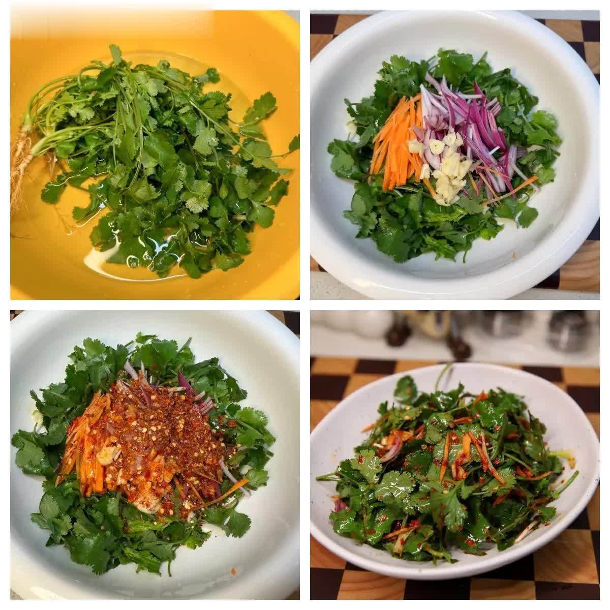 把洗好的香菜切成小段,加入胡萝卜丝,洋葱丝,蒜末,来上少许盐,一点松茸鲜,一大勺粗辣椒粉,浇上热油激发出香味,再加入一勺生抽和一勺芝麻香油,拌匀即可享用,香辣开胃。