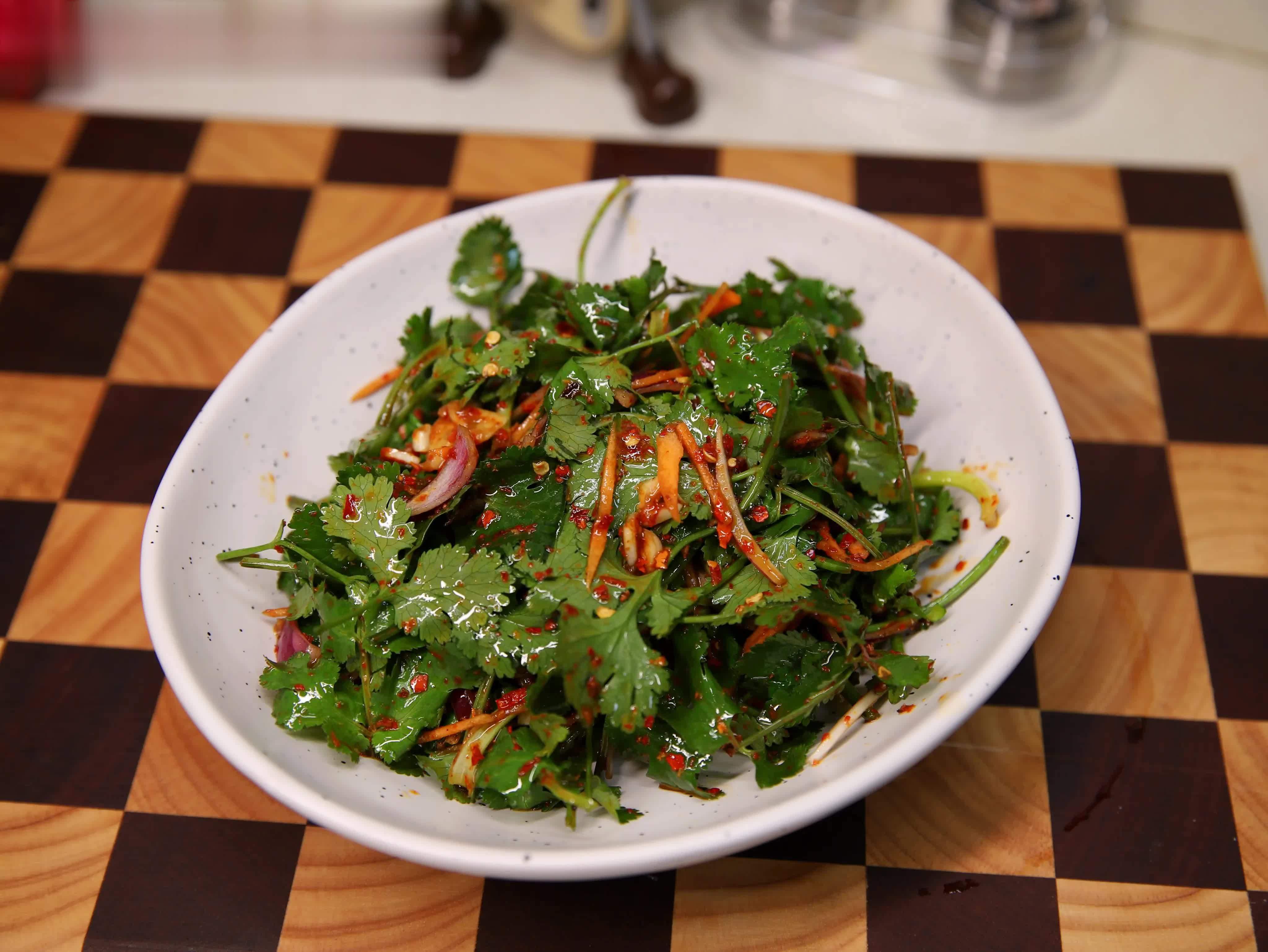香菜清洗干净,如果根部比较嫩可以连根一起拌,如果较老就切去根部不要。