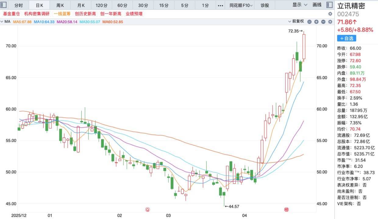 4月27日,立讯精密股价在开盘后快速冲高至72.35元/股,创历史新高,随后在高位震荡运行,截至午间收盘,其股价报71.86元/股,总市值为5235.71亿元。