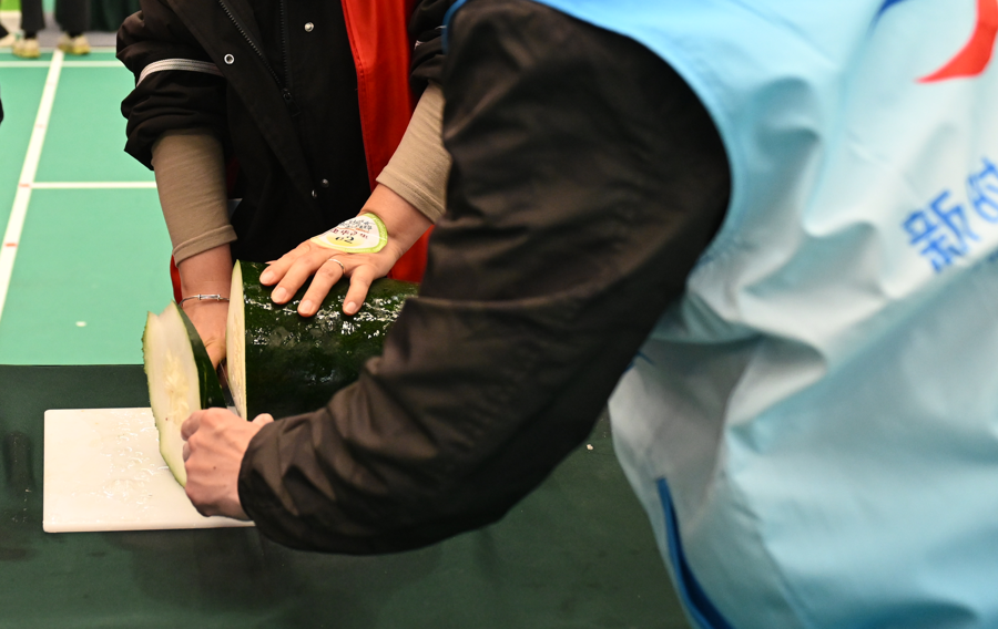 整天和菜篮子打交道的市集职工进行技能比武,比点啥?不比舞文弄墨,不考理论知识,考的就是手上功夫。谁捆的鸡蛋最牢?谁一刀下去切的冬瓜分量和一把抓的蔬菜分量最准?谁又能在限定金额能帮“顾客”精准搭配品种和数量?……这场充满烟火气的技能比赛,考出了徐汇区市集职工的真本领。