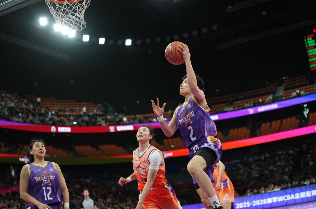 3月22日,在陕西西安举行的2025-2026赛季WCBA全明星赛中,南区明星队113比110战胜北区明星队。图为南区明星队球员杨舒予(上右)在比赛中上篮。新华社记者 李一博 摄