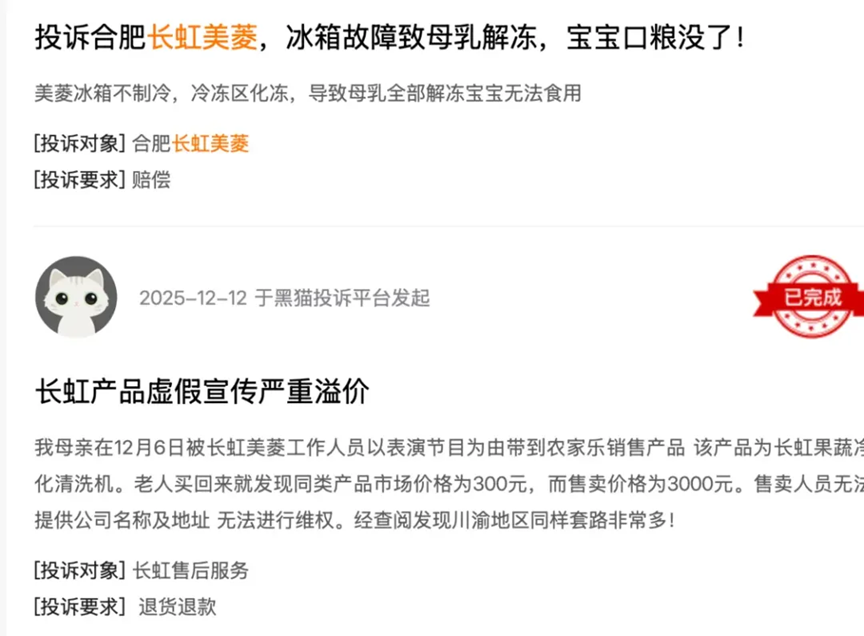 近年来,关于长虹美菱冰箱、油烟机等产品故障的投诉在各大消费者平台不断涌现,仅黑猫投诉平台上,涉及长虹美菱的投诉就有200多条,问题集中在“冰箱制冷效果差”“售后维修推诿”“油烟机异响”等方面。