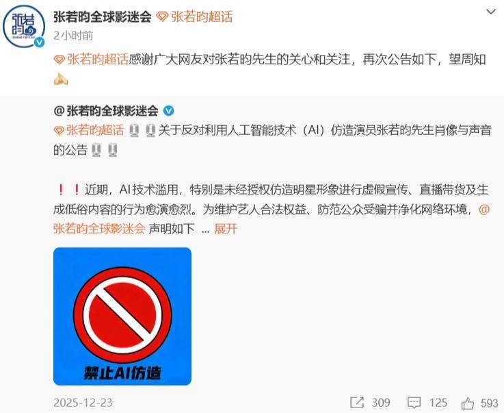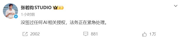 4月20日,张若昀工作室发文:没签过任何AI相关授权,法务正在紧急处理。