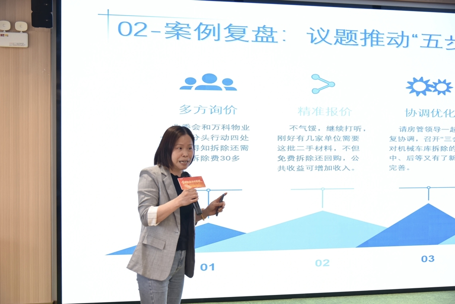 当天,马桥镇四季悦园业委会交叉任职干部陈洁娣来到现场,以自身“党支部委员+居委会委员+业委会委员”的多重身份,讲述了“小区机械车位改造”的攻坚故事。这是困扰小区近十年的棘手问题。