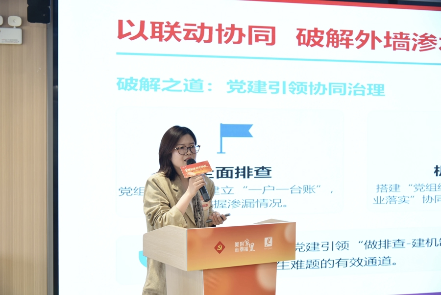 该小区自2016年交付以来,先后有491户出现外墙渗水,过保维修、资金使用、施工协调的难度都很大。居民区第一时间全面排查、一户一档、建立台账,针对居民对维修基金使用的顾虑,党员和楼组长上门讲政策、解疑惑,形成党组织牵头、业委会主抓、物业落实的协同机制,全程跟踪、严把质量。到目前,小区已完成维修431户,剩下60户也在有序推进,真正把居民的“心头病”变成了“放心事”。