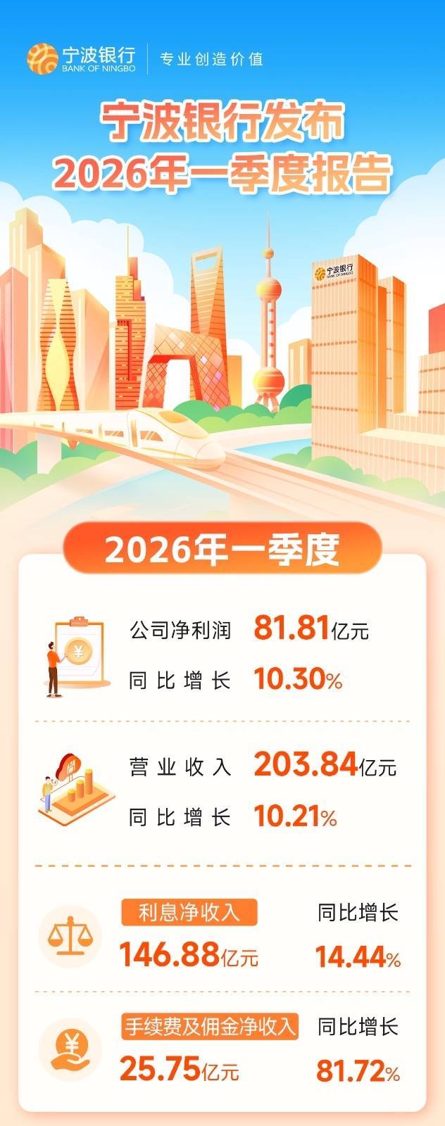 2026年一季度,宁波银行实现归属于母公司股东的净利润81.81亿元,同比增长10.30%;实现营业收入203.84亿元,同比增长10.21%,其中利息净收入146.88亿元,同比增长14.44%,手续费及佣金净收入25.75亿元,同比增长81.72%。在净利润和营业收入实现“双十”增长的同时,利息净收入、手续费及佣金净收入均表现亮眼,使得宁波银行经营发展根基持续夯实。